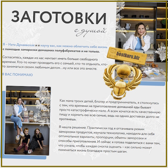 Это не просто курс. Это – настольная книга каждой хозяйки, которая хочет облегчить свою жизнь и не торчать каждый день на кухне. Поверьте, на моем курсе нет скучной информации о том, как заморозить 10 кг вишни на зимний компот.