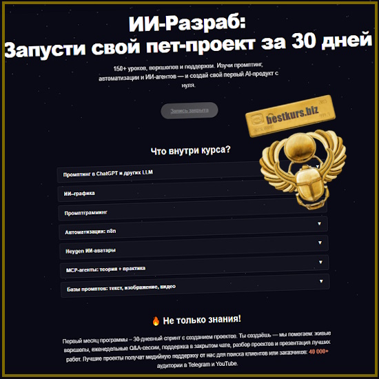 Первый месяц программы – 30-дневный спринт с созданием проектов. Ты создаёшь — мы помогаем: живые воркшопы, еженедельные Q&A-сессии, поддержка в закрытом чате, разбор проектов и презентация лучших работ. Лучшие проекты получат медийную поддержку от нас для поиска клиентов или заказчиков: 40 000+ аудитории в Telegram и YouTube.