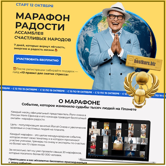 За 2, 5 года наш Марафон радости прошли более 40 000 человек из 20 стран мира. Марафон проводит Митя Ефимов — клинический психолог, Мастер Йоги смеха и двукратный чемпион мира по смеху.