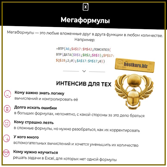 ‌ Если это не так, но на интенсив всё же очень хочется, то, конечно, приходите — полученные знания в любом случае будут вам полезны, так как я покажу много нюансов, которые также важны при работе с самыми простыми и обычными формулам. А с мегаформулами в работе вы рано или поздно всё равно столкнётесь и после интенсива будете морально и технически к ним готовы