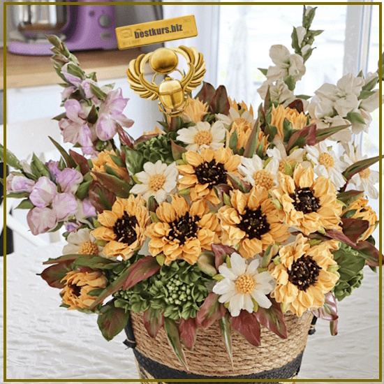 Букет с зефирными цветами: подсолнухами, гортензией, ромашками и гладиолусами — осенний, яркий и праздничный!