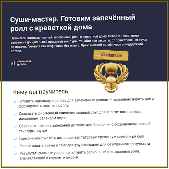• Результат: сможете уверенно готовить роскошный ресторанный ролл, впечатляющий и вкусом, и видом!