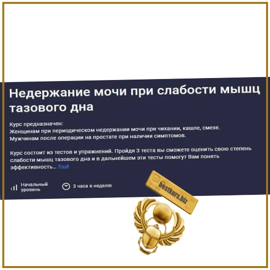 Курс предназначен: Женщинам при периодическом недержании мочи при чихании, кашле, смехе. Мужчинам после операции на простате при наличии симптомов. Курс состоит из тестов и упражнений. Пройдя 3 теста вы сможете оценить свою степень слабости мышц тазового дна и в дальнейшем эти тесты помогут Вам понять эффективность упражнений. Примерное время прохождения тестов 15 мин. Затем можно приступать к упражнениям их всего 10, просмотр видео займёт 15 мин. Примерное время выполнения всех упражнений 45 мин.