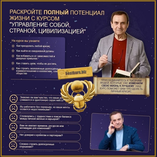 • Курс «Управление собой, страной, цивилизацией» помогает преодолеть личный кризис и выйти из рутины.