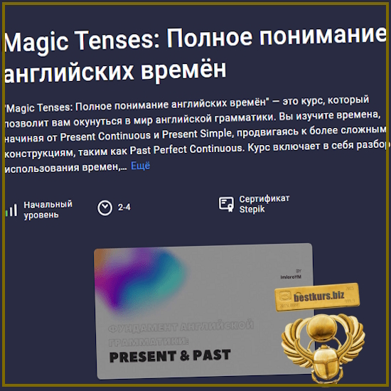 Курс “Magic Tenses: Полное понимание английских времён” предназначен для тех, кто только начинает изучать английский язык или хочет укрепить свои знания в области времен группы Present и Past. Курс состоит из 13 тем, каждая из которых посвящена определенному времени и его использованию в различных ситуациях.